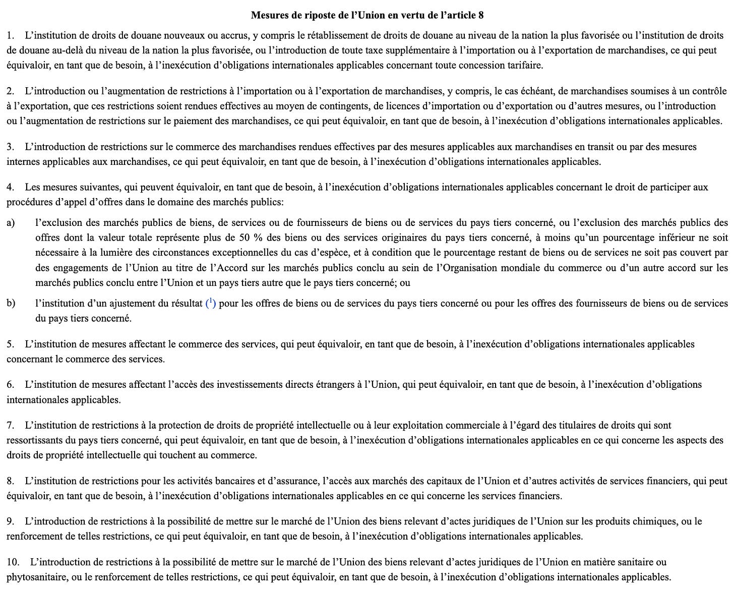 Le règlement 2023/2675 du 22 novembre 2023 vise à doter l’UE « d’un instrument approprié permettant de dissuader les pays tiers d’exercer une coercition économique et de contrecarrer une telle coercition économique afin de protéger ses droits et ses intérêts ainsi que ceux de ses États membres. Ceci est le cas en particulier lorsque des pays tiers interfèrent dans les choix souverains légitimes de l’Union ou d’un État membre en appliquant ou en menaçant d’appliquer des mesures affectant le commerce ou les investissements afin d’empêcher la cessation, la modification ou l’adoption d’un acte particulier par l’Union ou un État membre ou d’obtenir, de l’Union ou d’un État membre, la cessation, la modification ou l’adoption d’un acte particulier, y compris l’expression d’une position par une institution, un organe ou un organisme de l’Union ou d’un État membre. » Le règlement fixe un certain nombre de critères pour élaborer ces mesures, notamment leur efficacité pour faire cesser la coercition économique. L’idée est aussi d’éviter ou à réduire au minimum les effets négatifs, économiques et autres, sur l’Union.